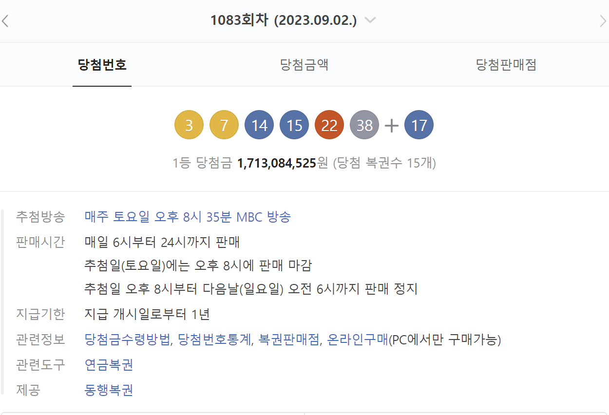 동행복권이 추첨한 제1083회 로또복권 당첨번호 조회 결과 15명이 1등에 당첨됐다. 이들의 1등 당첨금은 각 17억 원씩으로 1083회 로또 1등 당첨자 중 8명이 자동으로 구매했다. 나머지 7명은 수동으로 1083회 로또 당첨번호 6개를 다 맞혀 당첨되었다.